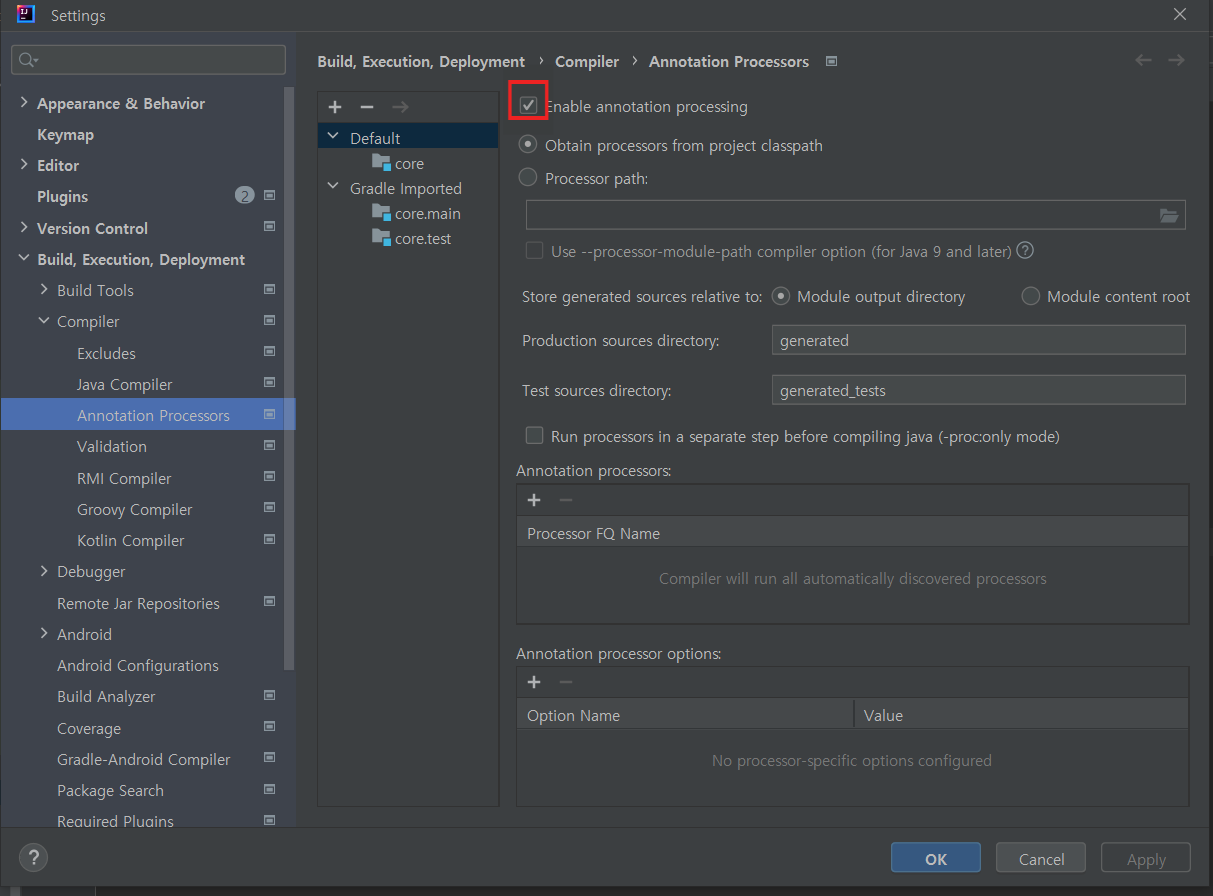 File - Settings - Annotation Processors 검색 - Enable annotation processing 체크 - OK 클릭