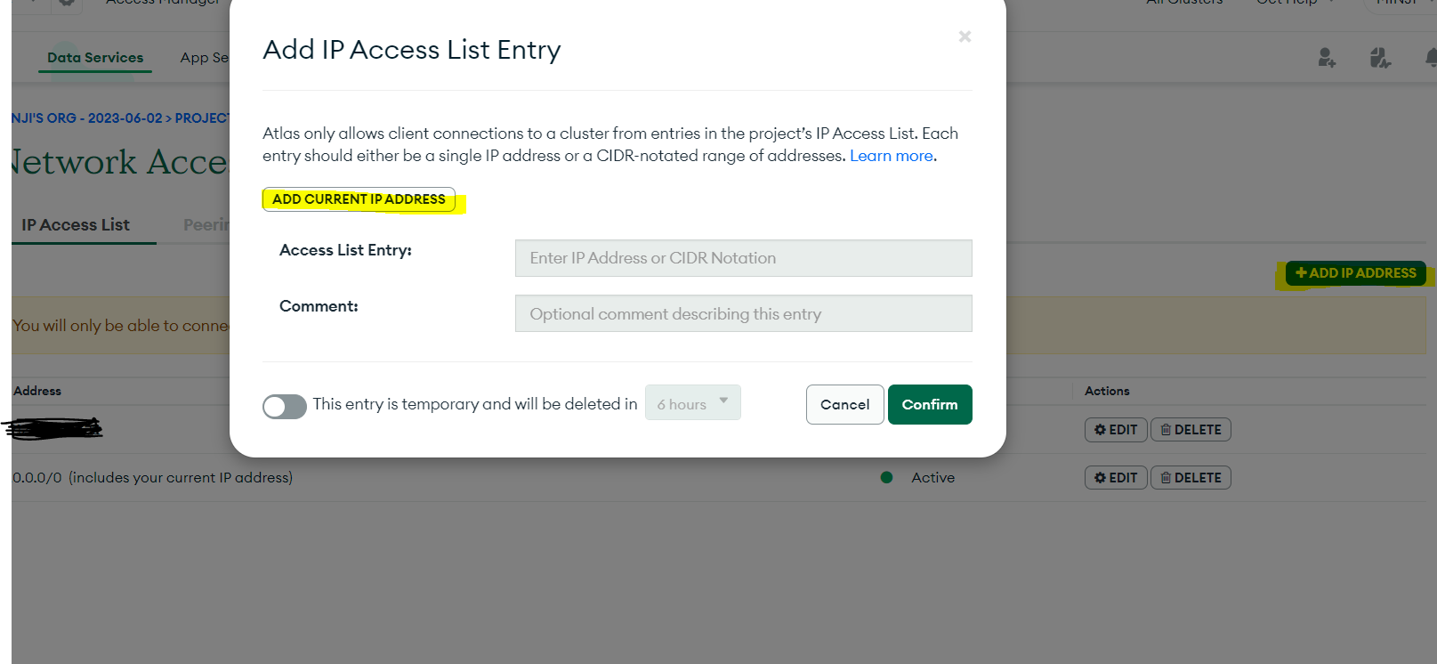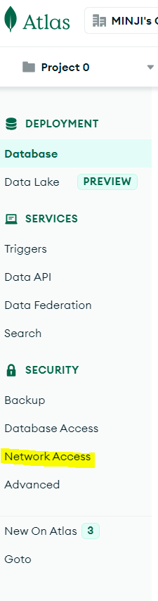 그때는 MongoDB Atlas에 접속하여 내 클러스터에 들어간 뒤, Network access에 들어간다.
